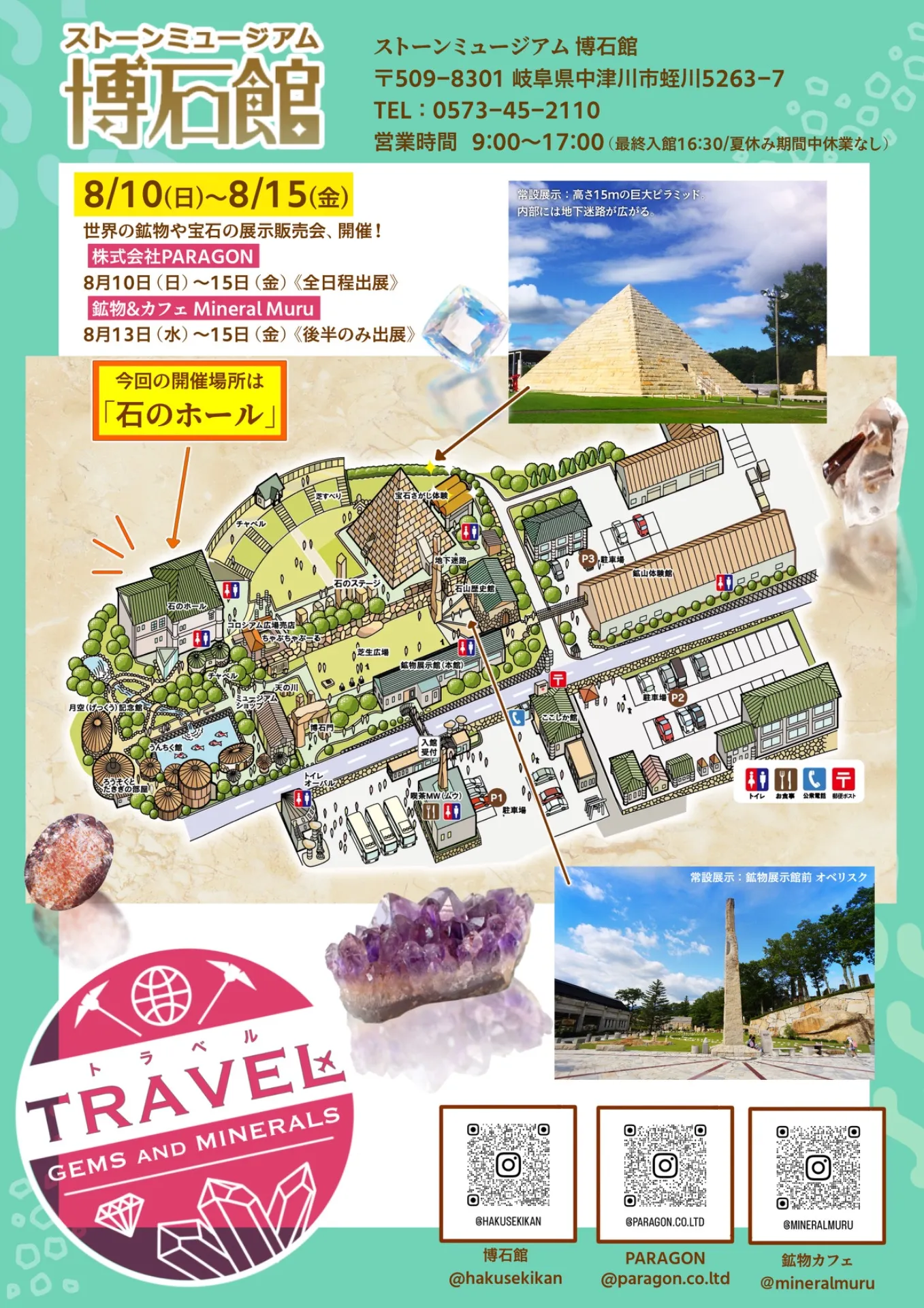 株式会社PARAGON(8/10〜15・全日程)と鉱物&カフェ Mineral Muru(8/13〜15・後半のみ)による、鉱物・宝石の展示販売会!